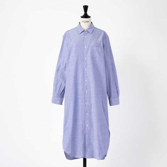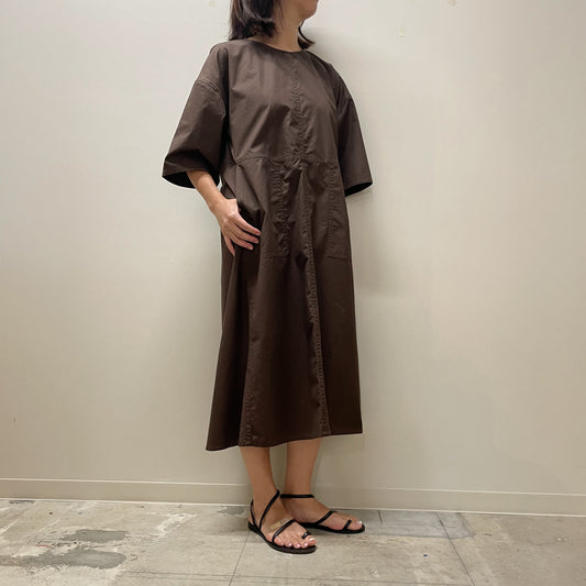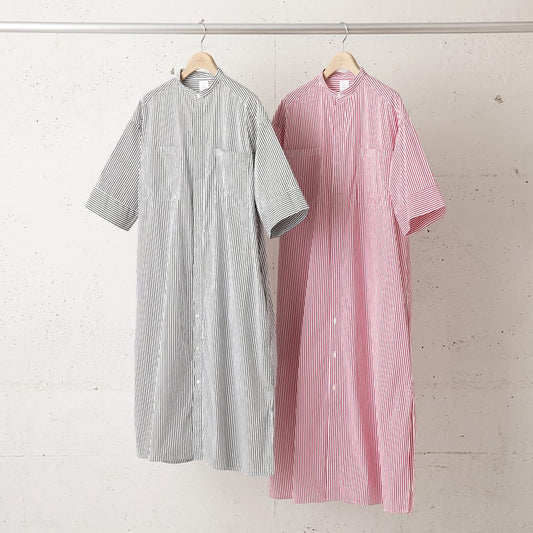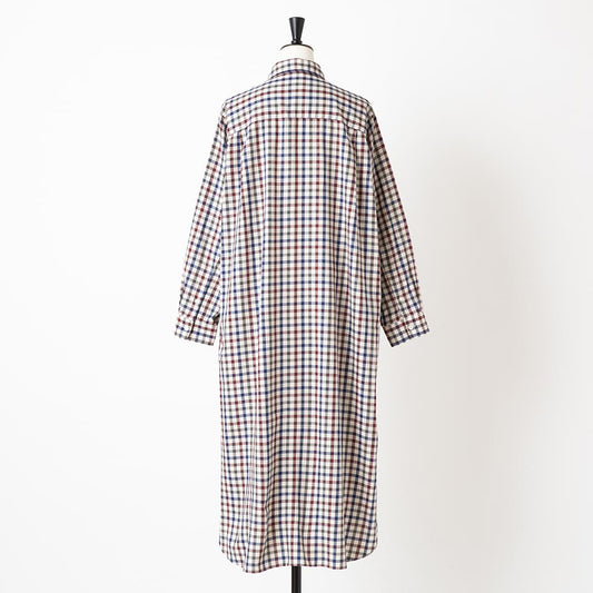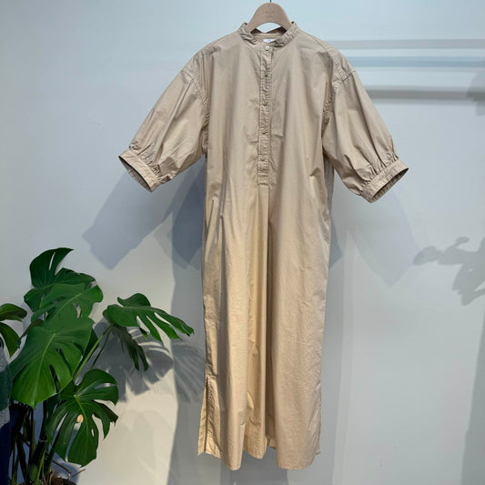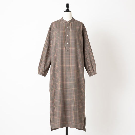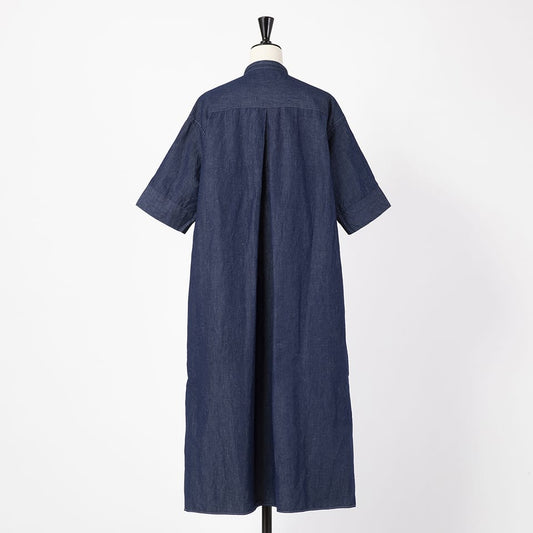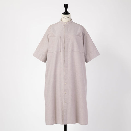 デザインは、極めてミニマル。バンドカラーに比翼仕立てのフロント、控えめなドロップショルダーなど、余計な装飾を排したことで、洗練された大人の佇まいを演出します。前開き仕様のため、ワンピースとしてはもちろん、羽織としても活用いただけるのも魅力です。