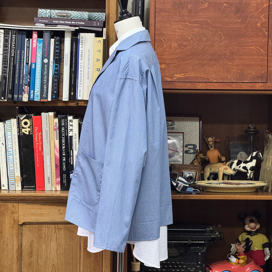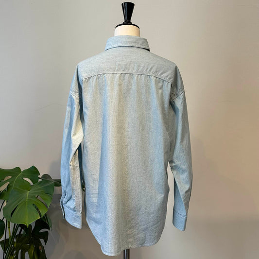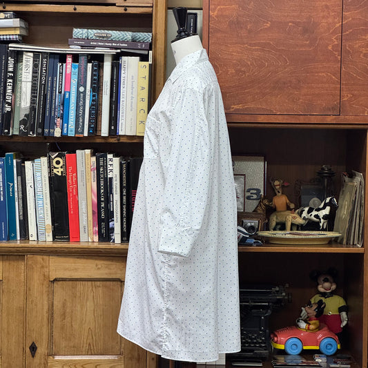 すっきりとした襟周りと胸元の切り替えが特徴的な一着です。1・2サイズは女性着用を想定し、肩幅や胸囲にゆとりを持たせたシルエット。3・4サイズは男性着用を想定して着丈や袖丈を長くとり、裾はロングテール仕上げとなっております。トップスとしてはもちろん、夏場の羽織ものとしての着用や、レイヤードスタイルにもおすすめです。サイドには深めのスリットが入っており、インアウトどちらのスタイルもしやすく、コーディネートに程よい抜け感が出ます。