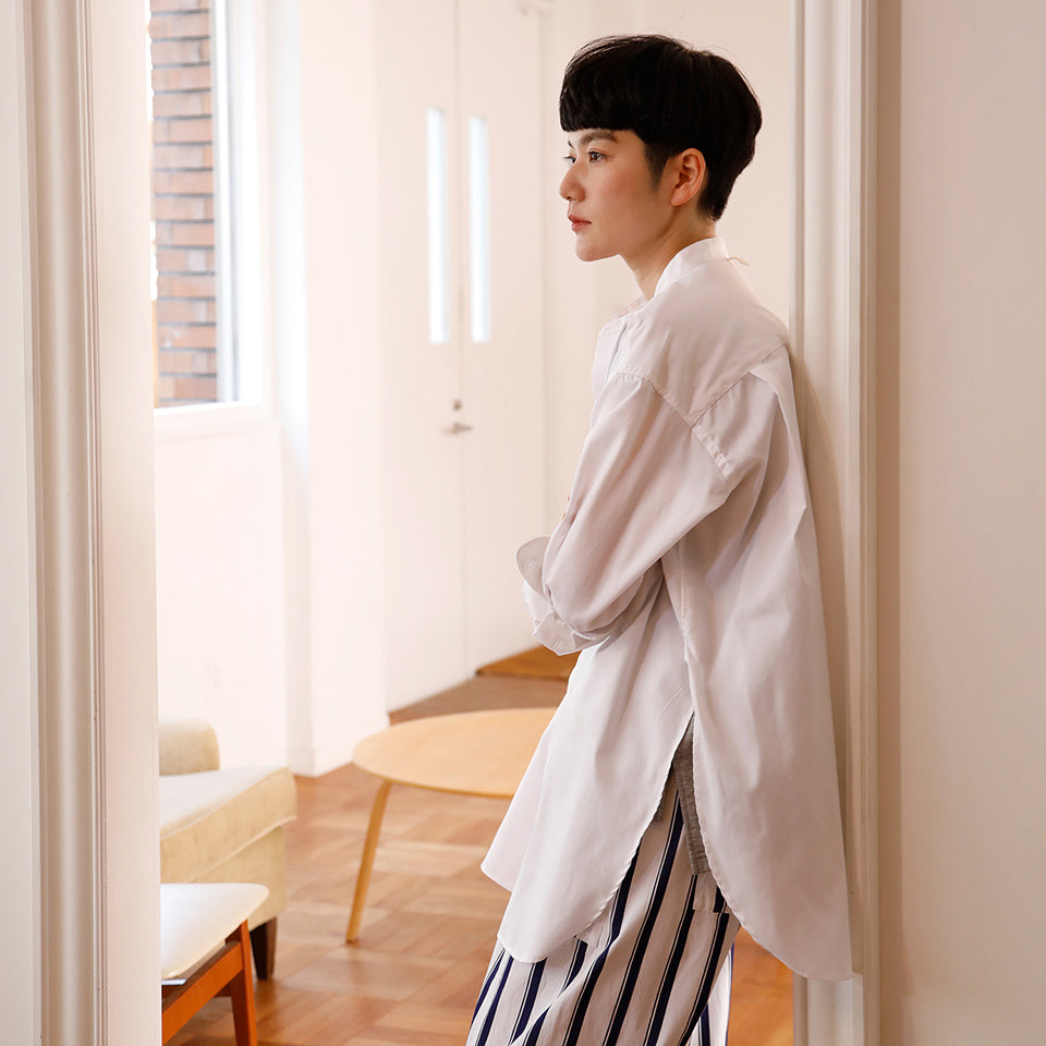 すっきりとした襟周りと胸元の切り替えが特徴的な一着です。1・2サイズは女性着用を想定し、肩幅や胸囲にゆとりを持たせたシルエット。3・4サイズは男性着用を想定して着丈や袖丈を長くとり、裾はロングテール仕上げとなっております。トップスとしてはもちろん、夏場の羽織ものとしての着用や、レイヤードスタイルにもおすすめです。サイドには深めのスリットが入っており、インアウトどちらのスタイルもしやすく、コーディネートに程よい抜け感が出ます。